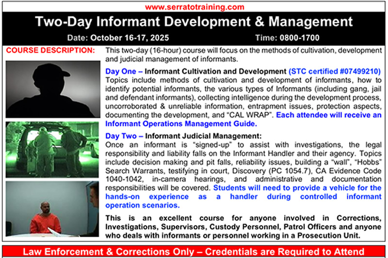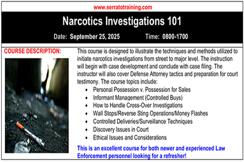 September 25, 2025. LOCATION: CALIFORNIA. This course is designed to illustrate the techniques and methods utilized to initiate narcotics investigations from street to major level. The instruction will begin with case development and conclude with case filing. - Press the '+' for more info!