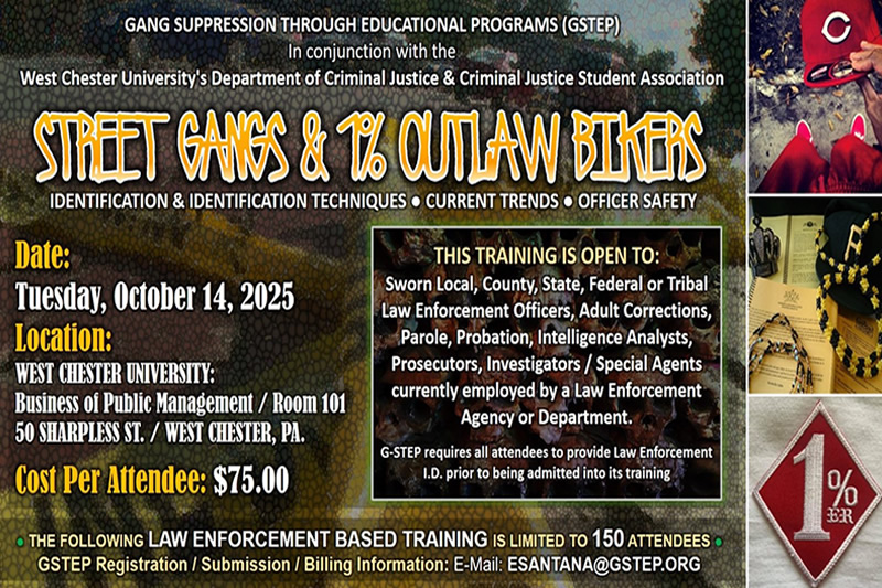 October 14, 2025. LOCATION: PENNSYLVANIA. Merging the Street Gang & Outlaw Motorcycle Gang Cultures, this unique training program is designed to focus on the historical similarities and differences, identified connections, activity and networking of the East Coast Bloods, Almighty Latin King & Queen Nation and the 1% Outlaw Motorcycle Gangs identified in New Jersey, New York and Pennsylvania. - Press the '+' for more info!